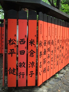 ◆ 拝観料700円を支払い霊宝殿に入って行くと、東洋のモナリザとも云われる「弥勒菩薩半跏思惟像」が安置されていた。 仁王門を出て、来たついでに東映太秦映画村に立寄った後、車折神社に向かうと正面に屋根付きのシャレタ鳥居が見えてきた。 参道を進むと花柳流や西田敏行、松平 健、米倉涼子などなどお馴染みの芸能人の名前が書かれた赤い玉垣がズラリを並んでいる。宝塚の人達の名前もあった。 祭神は商売繁盛の神・清原頼業である。一族の「清少納言霊社」や「清めの社」という社もある。芸能の神でもあるらしい。 |