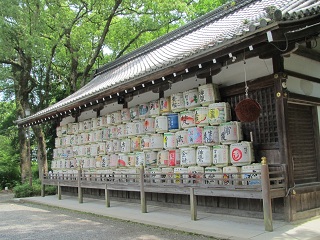 ◆ 山内の妙智院で湯豆腐でも食おうかと思ったが、メニューを見ると、この際ここは素通りして渡月橋を渡り「松尾大社」まで行ってみた。 松尾の門前町に入ると品格ある町並みが続いている。 大鳥居から石畳を進み「桜門」をくぐると「拝殿」。ここは酒造の神様らしく、献納された灯籠に「松尾大社日本第一之酒造之神」と刻まれていた。 境内には酒樽が積まれた神輿庫もあった。 |