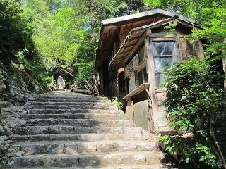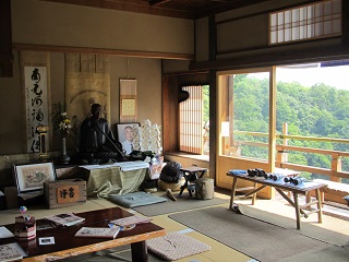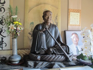 ◆長い石段を登りきると客殿に法衣姿で石割斧を持ち、片膝を立てている角倉了以の木造が安置されていた。
