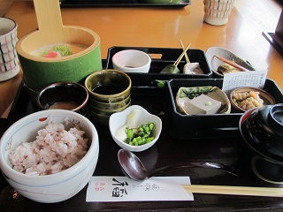 昼食は桂川沿いの「稲」で摂った。手桶湯ば御膳を注文、予想通りかなりうまい。。 |