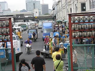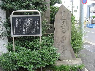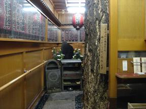 | ◆「佃地蔵尊」の案内板を見つけ、狭い路地を奥へ入って行くと御堂が祀られていた。月島と云えばもんじゃで、「麦」や「近どう本店」などもんじゃの店がズラリと並んでいる通りを抜けて「十辺舎一九の墓」まで行ってみた。 辞世の句「この世をばどりあお暇に線香の煙とともに灰左様なら」とあった。勝鬨橋を渡って築地へ戻り、海幸橋門から中央卸市場へ入って行くとさすがに観光客や水産物、青果を積んだカートや車で賑わっている。 魚河岸横丁わきの「水神社遥拝所」に上がると場内の雰囲気を眺められる。 |