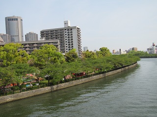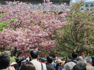 桜の通り抜けが開催さてれいる造幣局へ入って行くと桜の真っ盛りの季節には少し遅すぎたが、それでも大川(淀川)沿いには屋台が立ち並び大変な人出だ。