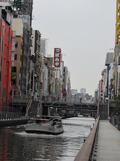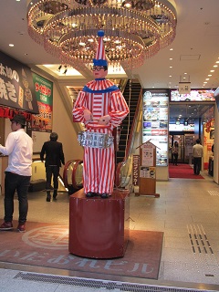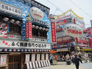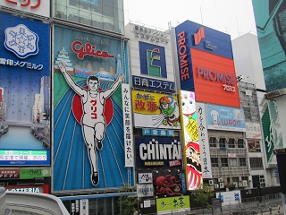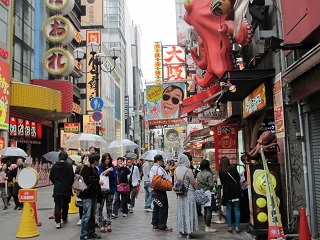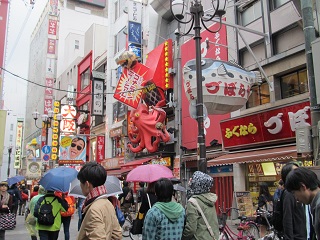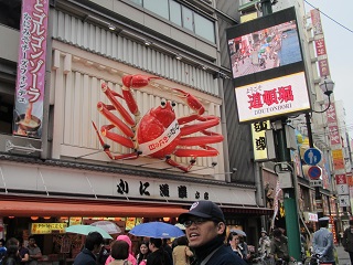 戎橋まで来ると、周辺の混雑ぶりは予想通り大変なもので、有名なグリコの看板、かに道楽、くいだおれ太郎など等見物しながらしばらく道頓堀通りを歩いてみた。