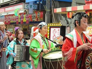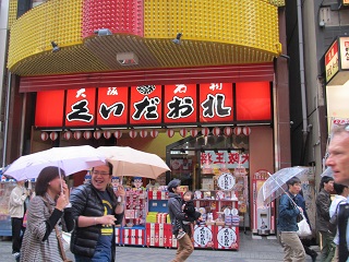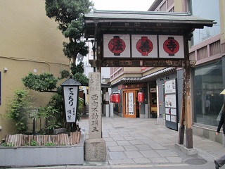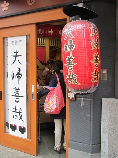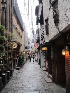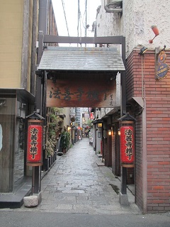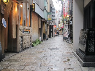 地図を見ると近くに「なんばグランド花月」もあるが、法善寺に向かい水掛不動尊に参拝して織田作之助の小説「夫婦善哉」で有名な法善寺横丁に入って行くと、石畳の路地の両側には小料理屋、バーなど雰囲気ある通りが軒を並べている。 |