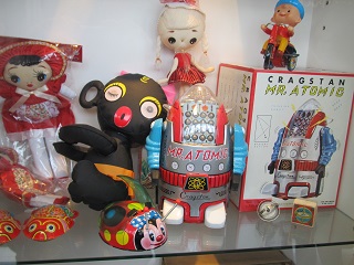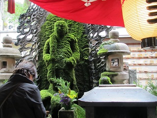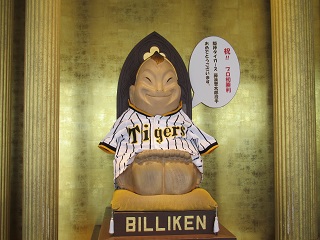 ちんどん屋やキン肉マンに出合いながら料金600円を支払い展望台に上がると、妙な姿をしたビリケン像が祀られていた。 |