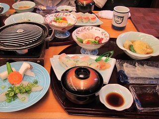 ◆ 何でも願いを聞いてくれる福の神だそうだ。時計も12時を廻った。フグ料理「ずぼらや」を見かけせん場膳を注文、評判通りの味で店内は年配客で満席状態だった。