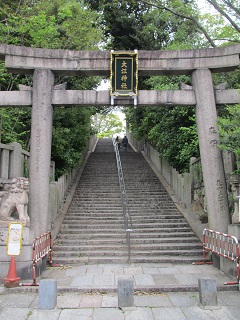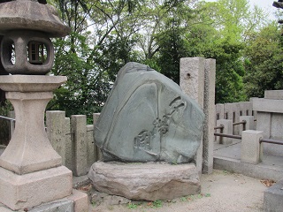 大江神社の101段もある長い階段(百歳の階段)を登りきり境内に入って行くと「夕陽丘」碑の側に「あかあかと日はつれなくも秋の風」と刻まれた古い芭蕉句碑があって、文字がかすかに残っていた。 |