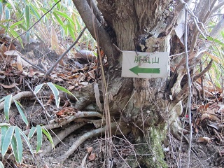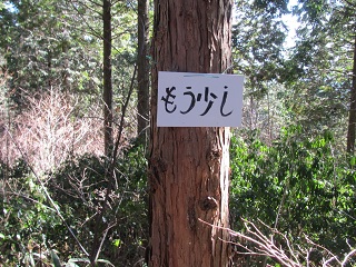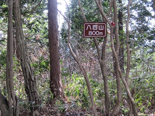 ◆ 斜面を登りきると八百山。その名のとおり標高は800m、目的の屏風山より少しだけ高い位置にあって、屏風連山の最高峰だが、周囲は林に囲まれ展望は無い。途中「もう少し」などと書かれた案内板もあって、この後すぐ頂上に来た。