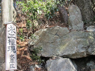 ここまでおよそ50分、腰掛岩に腰を下ろし小休止。ここから見えるはずの御嶽山はあいにく雲に隠れ全く見えない。コシアブラの木が目立つ登山道を進むと展望台との分岐に出た。せっかく来たのだから展望台まで行ってみると登山口の大草集落が一望でき、側に大草区の永王権現が祀られていた。 |