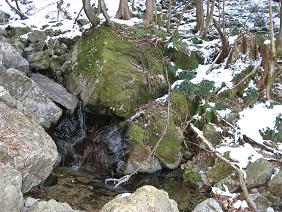 登山口からは沢沿いの道となり、やがて沢から離れ植林地の中を抜けて行く。1時間ほどのアプローチで道は一度沢に近づいた後、「最後の水場」の標識のある水場に着く。
