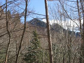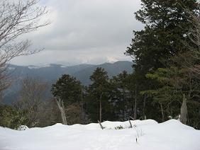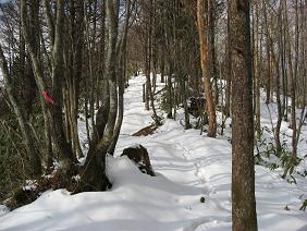 ところどころ尾根道の左右は45度ほどの切下がった斜面で慎重に進む。登山者に踏み込まれていない道は、道筋がはっきりせず2,3日前に降った雪で足を滑らせる。樹木や潅木に掴りながら最後の急登を登り尾根に出ると緩やかな道となるが、指導標もなく背丈ほどもあるササのヤブ漕ぎの道となりテープをたよりに進む。