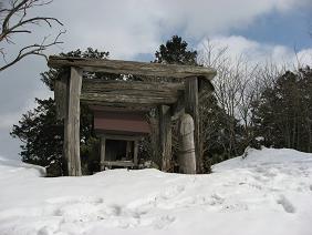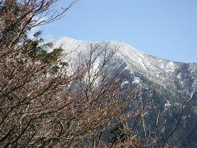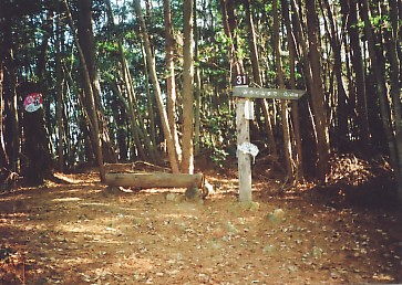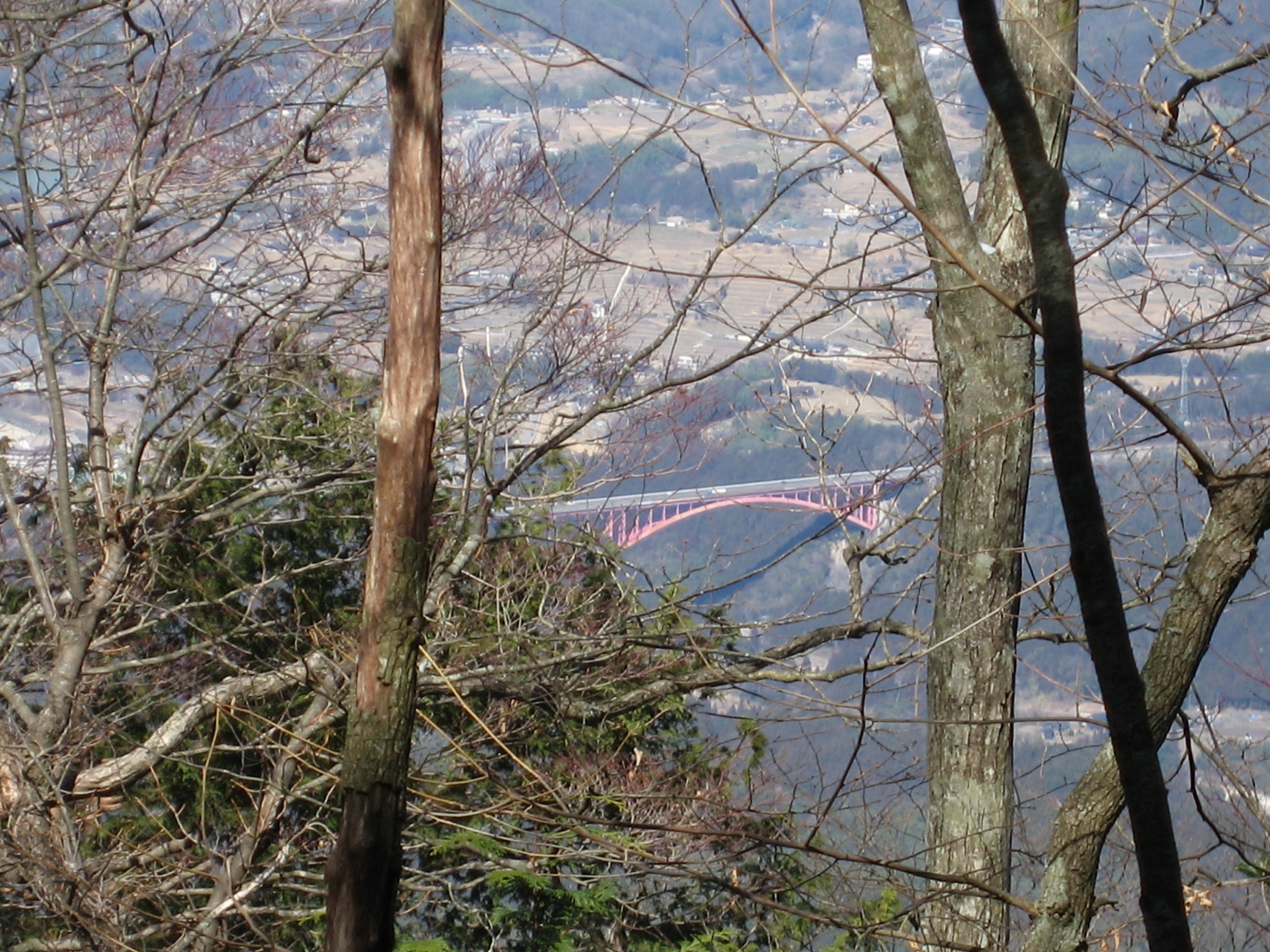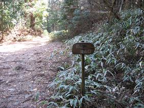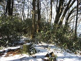 恵那山が見える場所を過ぎ、尾根道を進むと三等三角点のある前山山頂に着く。山頂は樹木に囲まれていて展望はないが、わずかに北側が開けていて眼下に中央自動車道が流れ、落合の集落が連なっている。軽装のためか冷気が気になり早々と下山する。 |