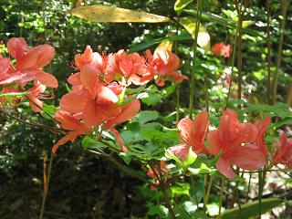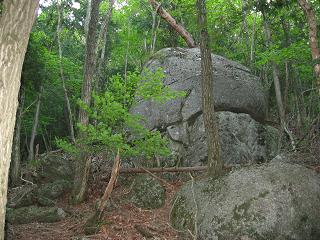 | ルートの紹介 ◆設楽町西納庫の津島神社へ向かう。神社前の登山口から個人の持山の林を歩くこと数分で茶臼山高原道路を横断し、「てんのう橋」を渡るとすぐ二合目の標識があり山道に入る。 薄暗い植林地の中を歩き、小沢を渡り天王川に沿って登っていく。15分ほどのアプローチで「岩伏観音」が現れ、急登を登ると一面ササの広い平坦地に出る。清流が流れる植林地の中の道はよく整備されていて、曲がり角の要所に指導標があって地図を見るまでもない...。 沢はしだいに細くなって山頂まで655mの案内板を見て進むと、矢作川源泉と岩伏山八合目の標識が見える。標高900mを過ぎた頃だろうか、西へ急な登りを行くようになると周りが明るくなって平坦な尾根道に出る。やがて最後の急登を登りきると岩伏山山頂に着いて展望が広がっている。 南東には奥三河の峰々が連なっている。看板には「武田信玄のろし台跡」とある。今日の献立はあいかわらず定番のオニギリ二個。景色を眺めながら食べる。 下山は南に続く急勾配の尾根筋を降りる。約20分で「山里遠望地」から展望が開け岩岳、段戸山を一望出来る場所に出る。笠石、はな垂れ石と呼ばれる巨岩やヤマツツジを眺めながら戻る。下山後、曾木温泉バーデンパークの湯にのんびり浸かる。 |