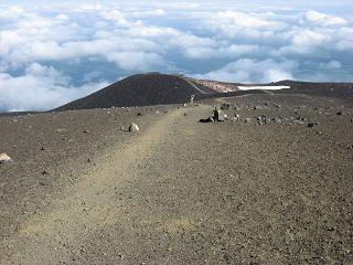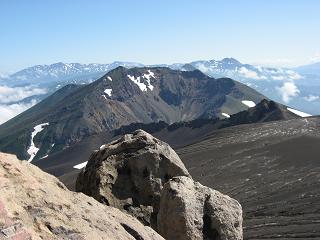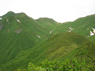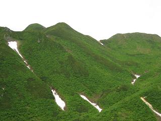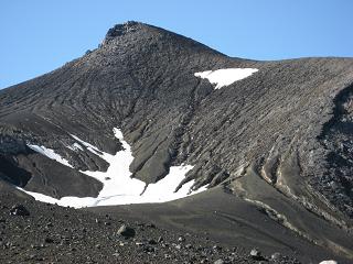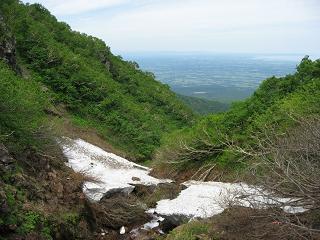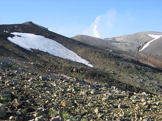 | 十勝岳山頂 | 谷筋に残る雪渓 |
