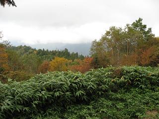 | ルートの紹介 ◆今年は気温が高い日が続き、紅葉は例年より1週間以上も遅れているらしい。東海北陸自動車道は飛騨清見から高山インターまでつながり便利になった。k氏を誘って国道158号線で丹生川村の集落に入り、塩屋から駄吉林道を国立乗鞍青年の家に向かう。 ここはすでに標高1510mあり涼しい。しばらくはカラマツやダテカンバの林道を歩き、日影峠を越えてブナの木平に向かう。岩井谷乗越の鞍部から緩やかな尾根を進み、シラカバ等の木々の間を歩くと避難小屋がある平坦な枯松平に出る。 途中水場付近で突然「バサ」「バサ」「バサ」の音...。キジが羽ばたいて横切り森の中へ消えていった。やがて「ガンバル坂」と呼ばれる急登の階段を登り切ると白山展望台に着いた。西方向が開けているが、あいにく厚い雲に覆われていて白山は見えない。ここまでおよよ1時間45分。 さらに「根性坂」の急な階段を登ること30分、ようやく尾根に出た。10分ほどで標高1956mの丸黒山に着く。山頂のスペースは広く、この山には三等三角点がある。天候がすこし回復してきてここから眺める乗鞍岳は素晴らしく、紅葉が始まっていた。 登山道は千町ヶ原を経て乗鞍岳まで続いているが10kmある。丸太に腰掛けてコンビニで買ったオニギリを食べ、しばらく景色を楽しんだ後下山。風が冷たく感じて汗もかかない山歩きとなった。 |