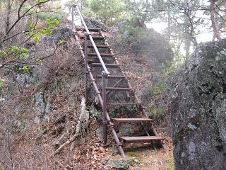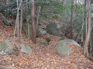 | ルートの紹介 ◆岐阜県土岐市の南・妻木城跡はなつかしい所で、何年か前に名岐ゴルフ場の入口の林道終点から歩いた記憶がある。久しぶりに土岐市駅から妻木町の崇禅寺を目標に進むと、県道388号線の南側に御殿跡と書かれた看板がある。ここから山道に入った道祖神の石碑の先に登山口があった。 崇禅寺は妻木城主代々の位牌や墓所があってここにも立ち寄ることにした。登山口付近は個人の所有地らしく大手口への道は通行止めとなっている。35分ばかりがんばって急坂を登ると明るい開けた「三の曲輪」で、北に妻木町の町並み、東に東海環状自動車道を一望できる。 天気が良ければ御嶽山から白山まで眺められるが、あいにくの天気でよく見えない。ここまで来ると少し汗ばんできた。ベンチに腰を下ろし小休止して南の石段を登るとすぐ本丸と呼ばれる「二の曲輪」から「一の曲輪」に出た。頂上のスペースはけっこう広く、八幡神社が祀られている。さすがにこの時期ひと気は全くない。 登山道はほとんど手が加えられていなく、当時の石垣が良く残っている。構造は山頂の本丸とそれより下の三の曲輪、さらに帯曲輪、南曲輪もあった。ふもとには御殿跡や士屋敷跡もある。帰りは「三の曲輪」から東へぐるっと回るコースを進む。 崖っぷちの道を過ぎて、薄暗い雑木林の中を人が積んだように見える巨石群や井戸跡など見物しながら蔵跡まで来るとデカイ倒木が道をふさいでいる。これをくぐり抜け、ホウバの枯葉ですべりやすい下道を時間をかけてゆっくり降り崇禅寺に寄り道して、あとは何よりもまず温泉に向かいスッキリした身体になって帰宅。 |