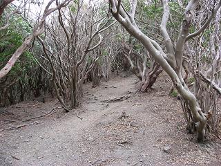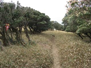 | ルートの紹介 ◆バスツアーハイキングを利用して三重県鈴鹿市の入道ヶ岳に出かけた。全行程6.0km 4時間のコースで展望に恵まれ頂上からの眺めは良い。名鉄バスセンターに向かうと大勢の登山者が出発の準備をしている。東名阪自動車道・鈴鹿インターから10分と便も良いが、高速道路料金の値下げがスタートしたせいだろうか?渋滞にまきこまれ登山口の椿大神社には8時35分に着いた。 北尾根ルートを歩き始めると最初から急な登りになって一汗かいたが、30分程で平坦な尾根が出てきた。この登山道の途中には1〜10までの数字が標示された通報ポイントが設置されていて、非常の場合に役立つようになっている。 避難小屋を過ぎて急斜面を登り、アセビのトンネルを抜けて進む。北の頭を越えないと目的地に着かないから1時間半も登りをやってやっと北の頭に出ると登山道の先に入道ヶ岳山頂が良く見える。天気予報では午後から雨らしい。オニギリと味噌汁で早めの昼食にした。 たまにはインスタント食品も顔をだすが、日頃から米の飯と味噌汁で生活しているので、これなしでは生活しにくくなっている。食後にコーヒーを入れて鈴鹿の山々を眺めながら一休みしていると下から登山者が次々上がってくるのが見える。小休止してほんの5分あまりの登りで頂上に来た。 山頂部はだだ広く360度の展望を味わえる所はそうめったにはなく、ここからの眺めは素晴らしい。バスの出発時間にはもう時間もあまりないだろうから、下山は二本木尾根コースを1時間20分も下ると登山口に着いた。 |