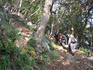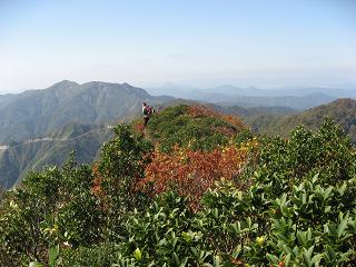 | ルートの紹介 ◆まだ行ったことがない山の向こうに何があるか気になって、一応見ないと気が落着かない。10月の山歩きはH氏から冠山はどうかと誘ってくれたので、すぐOKの返事を出した。K氏を誘ったところ最近体調を崩して病院なんかまるで縁がなかったが、急に弱気になったようだ。 久しぶりに三人そろって越美山地の冠山へ出かけた。国道417号線を冠峠付近まで来ると、烏帽子冠に似た冠山が見え始めた。紅葉のまっさかりにはまだ少し早いが、駐車場に車は満車状態で混雑している。11月に入れば冠峠あたりのブナの原生林の黄葉はすばらしいだろう。 まず尾根合流点を正面にして30分ばかり明るい山腹を進んだところで標高1156mの小ピークあたりまで来たが、標識もなく気付かずに通過してしまった。登山道の脇にはナナカマドが赤い実を付けていて良く目立つ。 冠平への道は人ひとりが通れるだけの幅だが良く踏まれていて、南に続くブナの原生林を一旦下り再び登って行くと、周囲は一面ササに覆われた広い冠平に出た。側に遭難の碑が立っており、昭和30年11月とある。ここまでおよそ1時間10分、上から次々と下山してくる登山者とすれちがいながらフィックスロープをたよりに15分も登れば頂上に到着。缶ビールで乾杯し、昼食とした。 あたりを見下ろすと360度の展望が広がり、地元の人らしい先客二人が徳山ダム方面をジット眺めていたが、しばらくして「お先に…」と声をかけて降りて行った。帰りがけに「道の駅・織部の里もとす」に立ち寄り、特産の富有柿を購入しこれを土産とした。 |