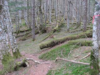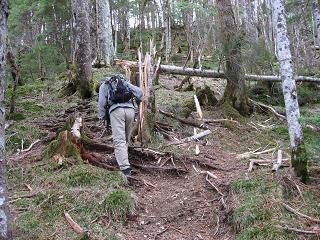 | ルートの紹介 ◆ゴールデンウイークが終り、いつもの大渋滞がすんだところをねらって手近で金もかからずしかもスッキリする所を探していたところ、1ケ月振りにH氏から飯田市上村の尾高山へ行かないかと誘ってくれたのですぐOKの返事を出したが、K氏は芦別岳を最後に1000級の山を終わりにしたらしく大切な山仲間を無くしてしまった。 この時期残雪の南アルプスの展望が楽しみで中央自動車道・飯田ICからおよそ40分、「しらびそ峠」に入ってみた。尾高山の標高は2212mと高いが、標高差で言うと約380m、頂上往復3時間半と予測して峠の階段jから山道を登って行くのだが、今朝は強い寒気が入り、風が冷たく気温は10度以下だろうか?かなり寒い。 急な坂を15分ばかり上がって尾根に出ると傾斜がゆりくなった。登山道の周りはやけに倒木が多く、一面苔に覆われている。前尾高山を越えてシラビソの林を下りていったら小さな原があって、バイケイソウの緑が美しい。尾高山の山頂部は林に囲まれ展望はないが、東へ少し行った先のビューポイントに出ると視界が開け明るい所に出た。 人影は全くない。荒川岳、赤石岳、聖岳など南アの山々が間近に見える。しばらく景色を眺めていたが、山にかかっている雲はとれそうもないからついに諦めて下山にかかる。帰りがけに日本のチロルと呼ばれている「下栗の里」を見物して飯田ICまで戻ってきたら、今頃になって天候が回復してきた。 今年から東北の山行を計画していたところ、突然」JALが45路線の廃止を発表した。やりたい事に集中したかったから思い切って」鳥海山」「秋田駒ヶ岳」へ行ってくる。丁度梅雨明けの頃だから具合が良い。 |