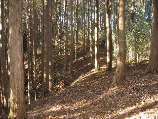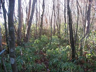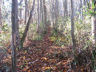 準備して出発。橋を渡り山腹にとりつくと、人がひとり通れるだだけの道幅だが良く踏まれている。傾斜はかなりキツク、周囲はヒノキの森で薄暗く遠望はきかないが、30分ばかり登って行って1032Pまで来ると、前方に段戸山の山頂部が見え始めた。