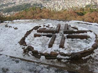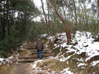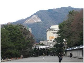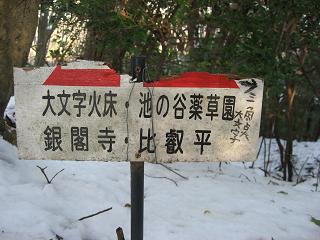 | ◆コースの紹介 今年の初登山は、なつかしい京都で1日をのんびり過ごそうと思い大文字山を選んだ。新幹線・名古屋駅からおよそ40分。京都駅から市バスで35分、銀閣寺前で下車すると琵琶湖疏水沿いに「哲学の道」が続いている。 銀閣寺橋を渡り参道を進んで行くと土産物屋が立ち並び、さすがに観光客が多い。右側には老舗らしい看板がある京漬物の「小松」がある。数分も行くと正面に銀閣寺の山門が見えはじめ、門前を左折し八神社の鳥居を目標に右折した先に大文字山の登山口があった。この山はゆっくり歩いても1時間程で登れてしまう。あまり運動としてはキツクなさすぎるが、正月の山はこのくらいが丁度いい。 沢沿いに登って行って小さな橋が出てきたら本格的な登山道になる。年末寒波の影響で雪が積もって踏み固められた道を慎重に進む。この日は朝からやけに寒かったが「仙人塚」まで来ると少し汗ばんできた。151段もある心臓破りの石段を登りきった先に「大」の字の中心の火床があった。 |