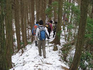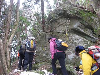 沢から離れ山道に入ると徐々に傾斜がキツクなって15分程登っていくと尾根が出てきた。ここからしばらく固定ロープが設置された尾根を直登することになる。夏だったら距離4km、標高差は450mと簡単なコースだが、今頃の登山道は年末寒波で積雪が残り、所々凍りついていて4本爪の軽アイゼンを用意した。 |