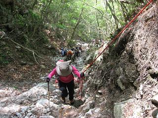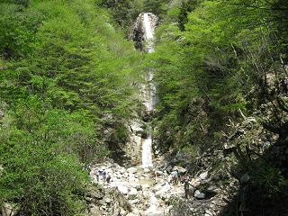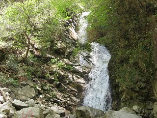 いつものことだがまだ行ったことがない山に登るのは楽しいもので、ガイドブックからは山全体のイメージはつかめないが、この3月に尾高山をテクテクやっていた時釈迦ヶ岳の姿を見た記憶がある。庵座谷の奥に向かって小1時間ばかり所々固定ロープが張られた斜面を登っていくと正面に「庵座の滝」が見えてきた。