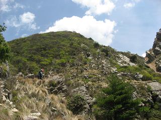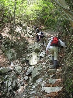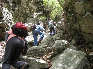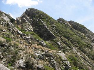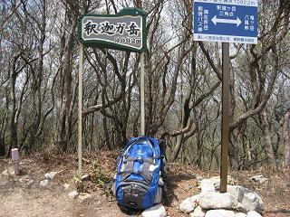 周囲は岩壁が切り立ってきて落差40mといわれる庵座の滝を高巻きしてその先の荒れた岩石が積み重なった登山道を登って行くのだが、崩落がひどくかなり体力を使う。二段の滝を過ぎると傾斜がキツクなって登りきるとようやく釈迦ヶ岳の最高点・標高1097mの松尾尾根の頭に出た。それにしても急な登りだった。