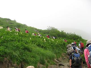 | コバイケイソウの登山道をゆく |
