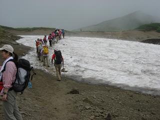 花見平手前の雪田をゆく |