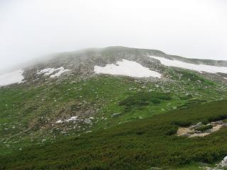 斜面を1時間も下ると双六池だ。双六小屋でひと休みしたところで、頂上往復2時間強と予測して双六岳に向う途中からとうとう雨になった。かなり疲れているが別に何でもなくレインウエアーを着込み斜面を登りきるとそこが山頂だった。一度見たいと思っていた双六岳だが、あきる程居れば心残りはない。