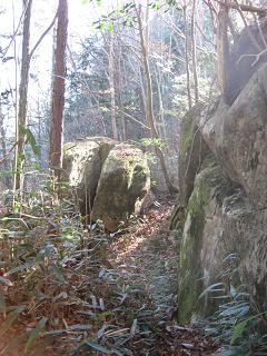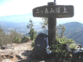 | 標高1223mの二ツ森山は岐阜県中津川市と加茂郡白川町の境に位置し、山名の由来は東側から見ると山頂部が形の良い双耳峰になっていることによる。二ツ森林道からの登山道が一般的だが、山登りの醍醐味はやはり切越峠から尾根を南下するコースで、登りきった大岩からの眺めは素晴らしく、第1級のハイキングコースである。 |