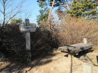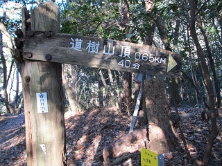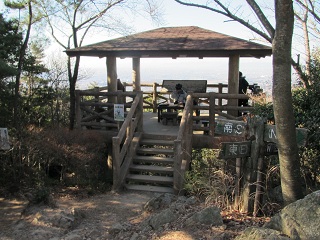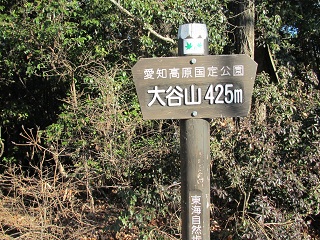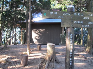 徐々に傾斜がキツクなってくるが、ほんの45分ほどで台地状に開けた所が見えてきて休憩所まで来ると尾根が出てきた。道樹山の山頂部は林に囲まれた広場で御岳神社が祀られている。ここから西に続く尾根を進むのだが、東海自然歩道の快適な尾根道が続く気分のいい所だ。登山者とすれちがいながら20分も行くと大谷山。この山には三角点がある。 |