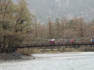 | ルートの紹介 ◆5月上旬、手術後のリハビリ中だったK氏から上高地はどうですか?と誘ってくれたのですぐOKの返事を出した。いままでまだ興味もなくて、一度も訪れたことがなかったが、調べてみると「上高地」は4月27日に開山祭が行われた。とにかく懐は別にしても暇だけはフンダンにある。 K氏の自宅で待ち合わせ東海北陸自動車道・美並ICから2時間、平湯バスターミナルから濃飛バスで25分、3時間半かけて上高地にやって来た。まず大正池に向かうと、朝から雲が多かったがとうとう雨だ。焼岳はガスに覆われてハッキリしない。それでもカメラのシャッターを押しながら木道を20分も行くと田代池に出た。 川沿いの梓川コースに入り、田代橋まで来ると近くに創業昭和8年の老舗「上高地帝国ホテル」がある。帰りの時間を考えると素通りしようかと思ったが、せっかくここまで来たのだからと思いなおして寄り道してみた。ほんの20分程の道草で済んでしまう。田代橋を渡るとすぐウェストンレリーフがあった。 |
