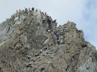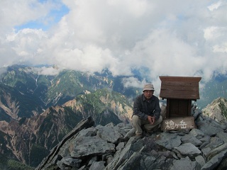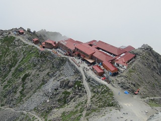 | ◆ 斜面を這い上がり「槍ヶ岳山荘」の前に着いたのは13時を廻っていた。山の天候は変わりやすく、とうとう西からガスが出てきた。槍ヶ岳の山頂を見ておこうと、山荘に荷物を置いてカラ身で頂上へ向かう。やはりスリルはかなりあったが山頂直下の鉄梯子を登りきると東に常念岳、南に奥穂高岳に続く稜線、北には黒部の山々が眺められ北アルプスの全ての稜線が集まっている。 ゆっくり味わいたい素晴らしい別天地でやって来るだけの価値はあった。三角点は皆が触れるから角が丸くなっている。山小屋の待遇は良く、食事もゴウカなもので、明日への活力が出てくるというものだが、体力を使い切り完全にバテた。まず一杯やると空きっ腹にアルコールがよく効いてすっかりいい気分になり天下の美酒である。 北アルプスの最高峰・奥穂高岳(3190m)も行って見ないではいられないような気持になって来年はねらってみようと決めた。温度計は無いけれども15度くらいだろうか?毛布一枚くらいあって寒くはなかった。横になって寝られるだけの広さだが、ゼイタクなど言っていられない。 |