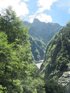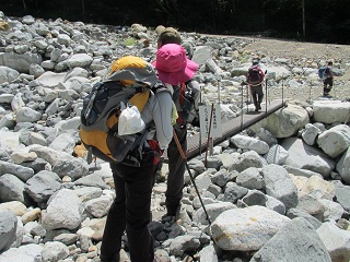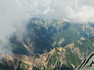 | ◆ 三日目の朝、雲海からの日の出を眺め、富士山、八ヶ岳、笠ヶ岳など等槍ヶ岳からの展望を十分楽しんで下山にかかる。 飛騨乗越から槍ヶ岳を見上げ、ドンドン下って行って藤木レリーフから滝谷出合ではもう一度穂高岳そして穂高の守護神・ジャンダルムが遠くに見えた。 白出沢出合に出たらあとはひたすら新穂高温泉へ下るだけだ。もう大分疲れているが1時間もかければ着くだろう。 |