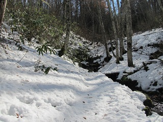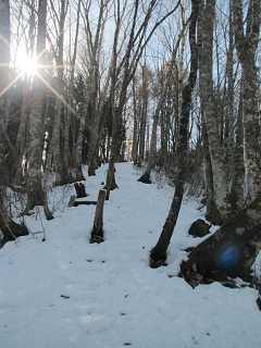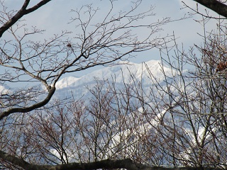 | ◆ 周囲は一面雪がベッタリ積もっていて、踏み固められていない雪道は歩きにくく、分かりにくい。一度ルートを外したが、40分ばかり雪の斜面を登って行くと正面に明るい所が見えてきて、直下の坂道を直登するのだが、かなり急で登りきるとピークらしい所に出た。 澄んだ空に鷲ヶ岳、大日ヶ岳そして白山が見える。見当山へは一旦下り登って行くのだが、この山への装備は軽装すぎて風が冷たく、ここで昼食を摂って下山することにした。かなり冷えたから帰りがけに「湯の平温泉」で長湯して冷えた体だを温めた。 |