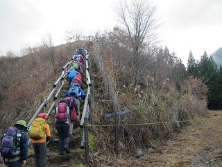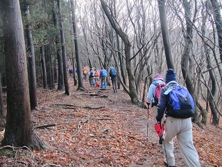 | ルートの紹介 ◆12月の第1週目は、バスツアーを利用して一度見たいと思っていた三峰山脈のピーク・三峰山を目標の山とした。三峰山脈の山々は標高1000m前後と低いが、高見山や三峰山は厳冬期には樹氷が見られることで知られ、山渓にも紹介されている。 自宅近くのコンビニでオニギリと行動食を購入、準備して出発。この時期 昼食に冷えた握飯なんか考えものだが、日頃から食べ慣れており、行程を考えるとゼイタクなど言っていられない。三重県側の「ゆりわれコース」登山口は、林道の一部が崩れ去って通行止めの為、名阪国道・名張ICから国道368号線で50分「道の駅 伊勢本街道 御杖」でトイレ休憩をとって奈良県御杖村の「みつえ青少年旅行村」へ向かった。 日帰り登山の場合は片道2時間で登山口に立つのが理想だろうが、かなり時間がかかった。登尾ルートを進み、三畝峠を越えて三峰山〜八丁平〜三畝峠〜新道峠を下りる距離およそ10.5km、4時間半かかる周回コースだ。登山口から山道へ入って行くと、しばらくの間はジグザグの道が通じていて休憩所まで来ると正面に三峰山が見え始めるがガスっていてはっきりしない。 |