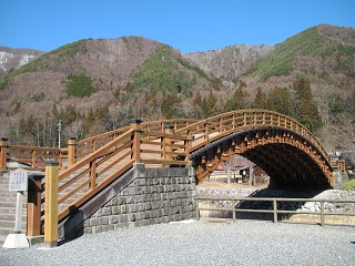 | 標高1197mの鳥居峠は中山道・奈良井宿と藪原宿を結ぶ屈指の難所で、林の中の道をのんびり歩くのは楽しいものだ。峠から木曽の山々の連なりと奈良井宿の眺めは心地よい。道の駅「奈良井木曽の大橋」の総檜造りの太鼓橋は必見。峠を辿る道は木曽氏と武田氏の戦いの跡や芭蕉句碑も残る。 |