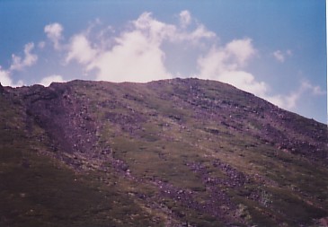 コメツガの木々の間を歩くことおよそ50分「のぞき岩」を過ぎたあたりから森林限界が近く標高2450m、お助け水の水場があった八合目の広場に出た。二人ともザックを降ろし、しばらく景色にみとれていた。後を振返ると若い男女が登って来るのが見える。