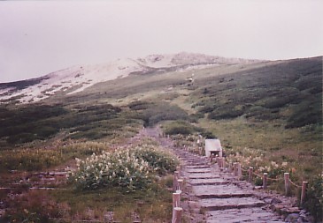 カメラのシャッターを押すのに夢中になる。標高2400mを過ぎたろうか?広々とした弥陀ガ原を進みハイマツの五葉坂を登りきるとようやく室堂に出た。あと30分も歩けば山頂に着く。時間は12時を回りコンビニで買ったオニギリを食べ、御前峰に向かった。