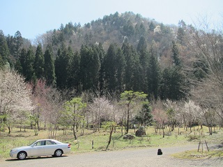 35分も登って行くと本丸に出た。スペースは思ったより広く、出丸との堀切もハッキリ分かる。構造は山頂の本丸の南に出丸、北に二の丸と城郭を囲む放射線状の竪堀が特徴的だ。途中東氏の家臣団の屋敷があった妙見集落を一望できる展望所があって、この時期タムシバの真っ盛りの季節で美しい。 |