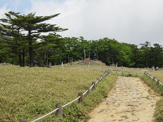 ◆ 案内板を見ると昭和34年の伊勢湾台風で森が破壊されてしまったとあった。一面ミヤコササに覆われシカも相当多いらしい。木道を上がり、正木峠を越えてしばらく行くと前方に大台ヶ原の最高峰・日出ヶ岳の山頂部が見え始めた。この山には一等三角点がある。山頂展望台に上がってみた。