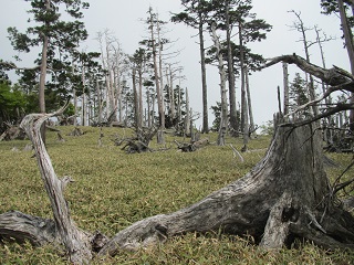 途中逆コースで下りてきた連中に出合いながら大蛇ーと呼ばれる断崖絶壁からの眺めを楽しんだ後、有名な正木ヶ原まで来ると立ち枯れたトウヒの台地が広がっていてシカを見かけた。 |