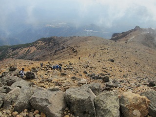 標高は2160m、ここから頂上まで標高差900mも登ると3000級の高山に登れる。鳥居をくぐり「大江大権現」付近まで来ると徐々に傾斜がキツクなってきた。頂上山荘に出ると、八丁ダルミと呼ばれる台地状に開けた向こうに山頂部が間近に見え、頂上は近い。あとほんの30分だ。 |