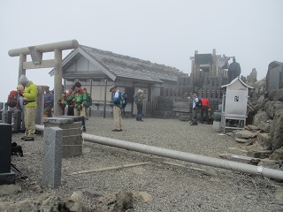 そして「三の池」に下りて、いつまで置いてもくさらないという御神水をペットボトルに酌んでこれを土産にするハズだったが、頂上に立つとガスに吹かれまっ白で何も見えなく、もう大分疲れてきた感じで諦めて下山にかかる。頂上山荘まで下りて来たら今頃になって雲がとれ視界が開けた。 |