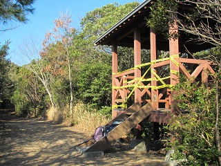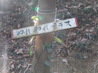 ここから急な坂道をドンドン下り、黒川池からの登山道が出てくると登り返して上がって行くのだが、百年桜新道のロープが張られた斜面はかなり滑りやすい。やれやれテラスと書かれた看板が見えてくると藤尾山は近い。 |