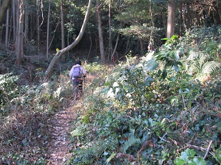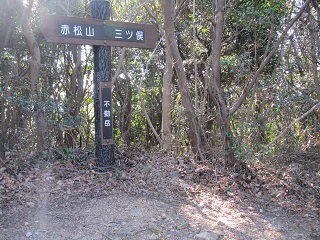 「稲荷山ハイキングコース」の案内板から山道に入るとすぐ尾根が出てくる。「稲荷山」のあずまやで小休止して、扇原の展望台からチゴユリ坂を上がると「赤松山」。「不動岳」まで来て左の薄暗い道を下りて行くと「迷子尾根の頭」に出た。