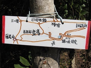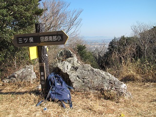 ◆前方から田原南部小学校の生徒達が下りてくるのが見える。藤尾山山頂は見晴らしが良く、冬でもポカポカ暖かい。先客が残した看板が立ち木に架けられていた。地図を確認して本当の三つ俣の分岐に出て、中西山へ向かう。